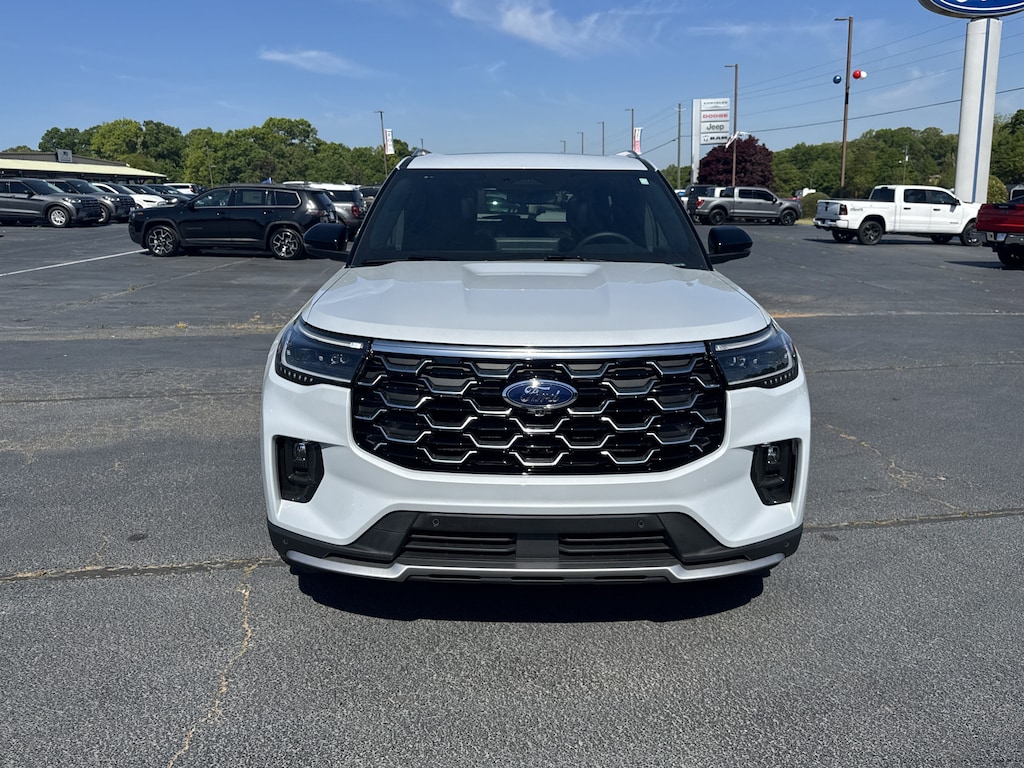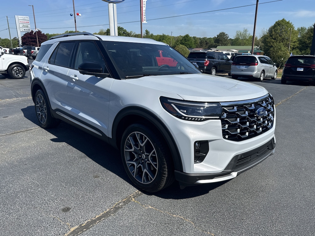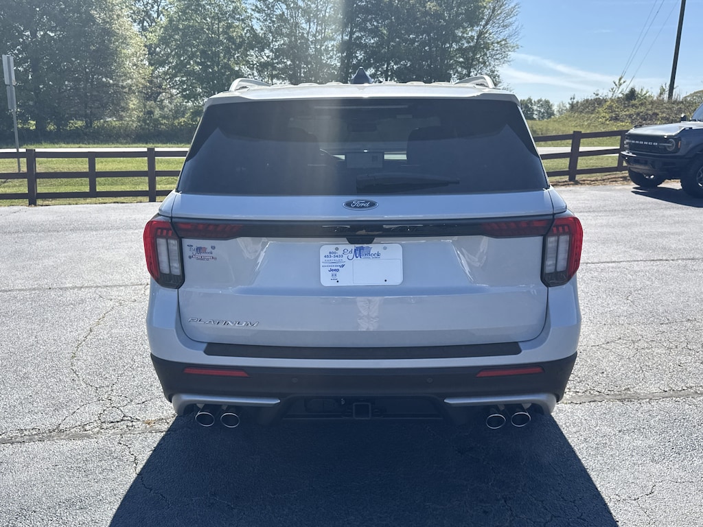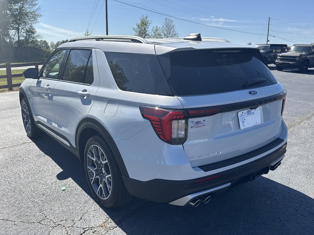 Certified. White Metallic 2025 Ford Explorer Platinum RWD 10-Speed Automatic 3.0L EcoBoost V6 14 Speakers, 3rd row seats: bench, 4-Wheel Disc Brakes, ABS brakes, Air Conditioning, Alloy wheels, AM/FM radio: SiriusXM with 360L, Auto High-beam Headlights, Automatic temperature control, Brake assist, Delay-off headlights, Dual front impact airbags, Dual front side impact airbags, Electronic Stability Control, Emergency communication system: 911 Assist, Equipment Group 600A Standard Package, Four wheel independent suspension, Front anti-roll bar, Front Bucket Seats, Front Center Armrest, Front dual zone A/C, Front fog lights, Fully automatic headlights, Heated front seats, Heated rear seats, Leather Seating Surfaces Sport Captain Chairs, Low tire pressure warning, Lux Leather Package, Memory seat, Navigation System, Overhead airbag, Platinum Badges on Front Row Seats, Power driver seat, Power Liftgate, Power steering, Power windows, Quilting & Stitching on Door Panels, Quilting & Stitching on Seats, Radio data system, Radio: B&O Sound System by Bang & Olufsen w/HD, Rain sensing wipers, Rear air conditioning, Rear anti-roll bar, Rear reading lights, Rear window defroster, Remote keyless entry, Security system, Speed-sensing steering, Speed-Sensitive Wipers, Steering wheel mounted audio controls, Tachometer, Telescoping steering wheel, Tilt steering wheel, Traction control, Trip computer, Ultimate Package, Ventilated front seats, Wheels: 21 Dark Alloy-Painted Machined Aluminum.Recent Arrival! Odometer is 13027 miles below market average!Certification Program Details: Ford Blue Advantage: Blue Certified* 139 Point Inspection* Transferable Warranty* Vehicle History* Warranty Deductible: $100* Roadside Assistance* Limited Warranty: 3 Month/4,000 Mile (whichever comes first) after new car warranty expires or from certified purchase date* and 11,000 FordPass Rewards Points to use toward first maintenance visit